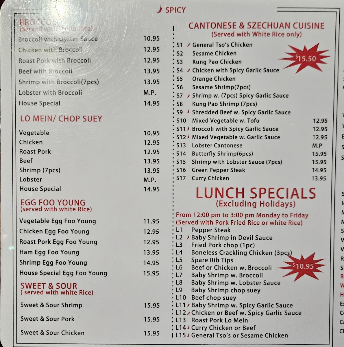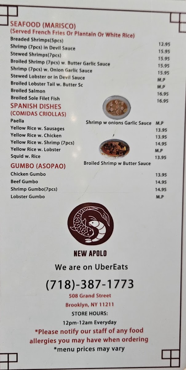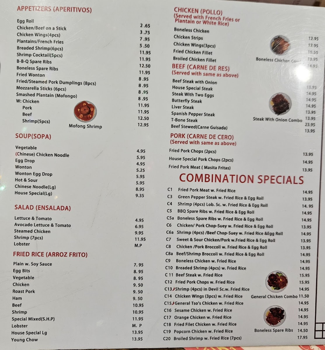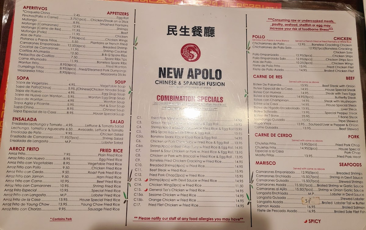 The menu at New Apolo is a treasure trove, featuring an array of enticing dishes that won't break the bank. Dive into their popular Combination Specials like the mouthwatering Chicken or Pork Chow Mein for just $6.25, or indulge in the Shrimp with Lobster Sauce at only $6.75. The stir-fried Beef or Chicken with Broccoli is a favorite among regulars, perfectly seasoned and served on a bed of tender vegetables. For those who adore a classic, the General Tso's Chicken and Pork Fried Rice are crowd pleasers that keep diners coming back for more, as echoed in the praises from patrons like Pedro Pacheco, who loved the leftovers after a satisfying lunch.